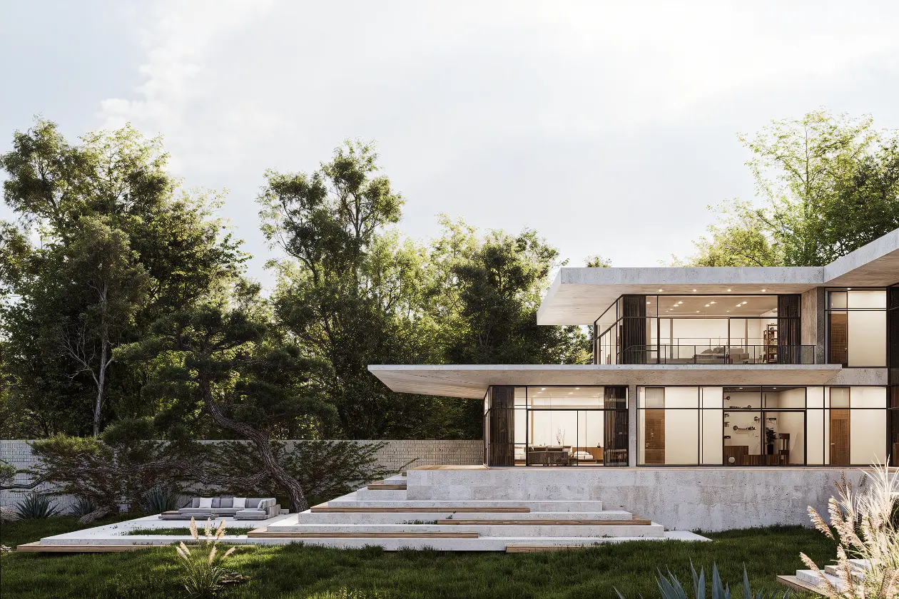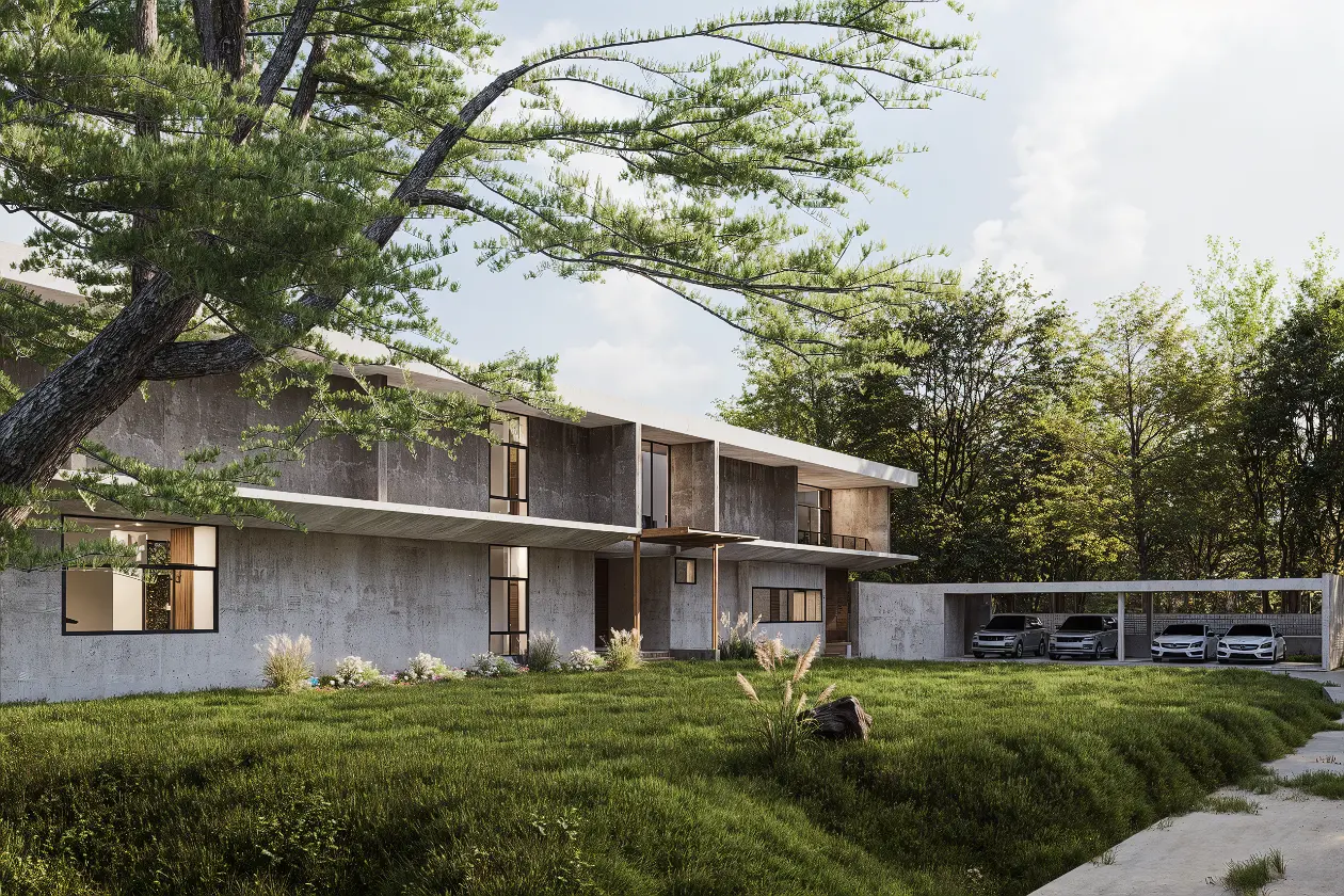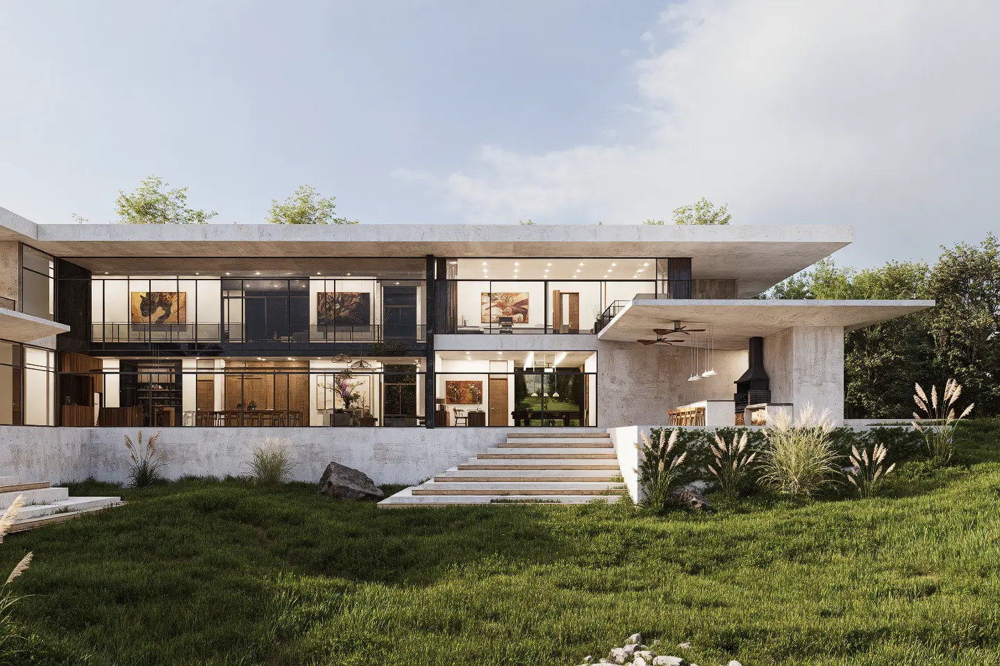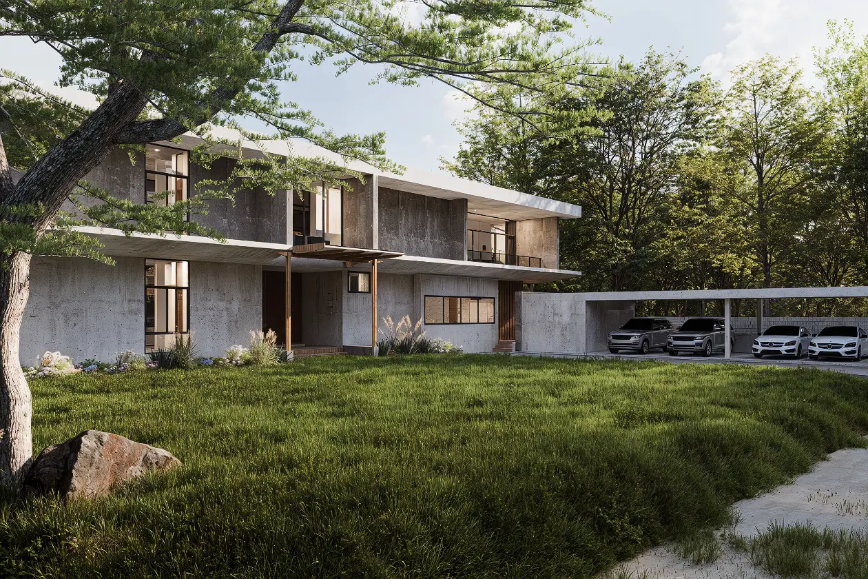 การออกแบบบ้านพักอาศัยสไตล์ Modern Tropical Brutalist มุ่งสร้างสมดุลระหว่างความดิบ เท่ และความอบอุ่น โดยถ่ายทอดเอกลักษณ์ของสถาปัตยกรรม Brutalist ผ่านโครงสร้างเส้นตรงที่ชัดเจน คานทึบแบบ cantilever และหลังคาระนาบราบ ผสานกับกลิ่นอายแบบ Tropical ที่ให้ความรู้สึกผ่อนคลายและกลมกลืนกับธรรมชาติ วัสดุหลักอย่างคอนกรีตเปลือยถูกเลือกใช้ร่วมกับไม้และกระจก เพื่อคลายความแข็งกระด้างของรูปทรงให้ดูนุ่มนวลขึ้น ภายนอกอาคารเน้นการสร้างมิติด้วยพื้นผิวคอนกรีตที่แตกต่างกัน โดยชั้นล่างใช้ผิวเรียบโทนสีอ่อนให้ความรู้สึกโปร่งและเบา ขณะที่ชั้นบนเพิ่มผนังลายหินสีดำเพื่อสร้างจุดเน้นและยกระดับภาพลักษณ์ให้ดูหรูขึ้นโดยไม่หลุดจากธีมหลัก ภายในบ้านออกแบบให้โปร่งสว่างด้วยช่องเปิดกระจกแนวกว้าง เชื่อมโยงพื้นที่ภายในกับภายนอก พร้อมเสริมบรรยากาศอบอุ่นด้วยวัสดุไม้ สะท้อนแนวคิดการอยู่อาศัยที่เรียบง่าย ทันสมัย และสอดคล้องกับสภาพแวดล้อมเขตร้อนอย่างแท้จริง.