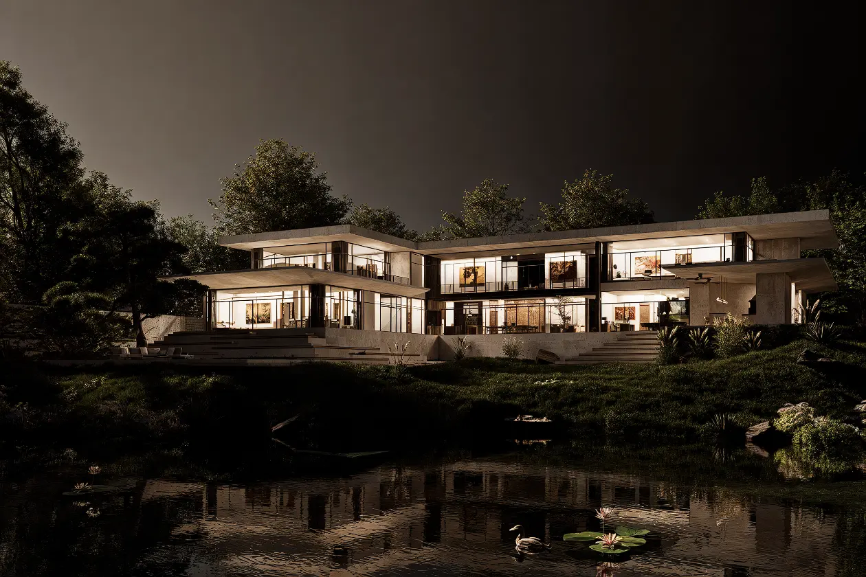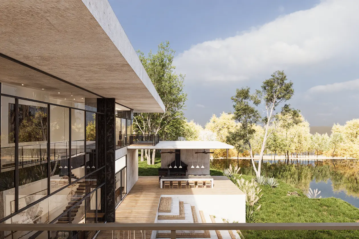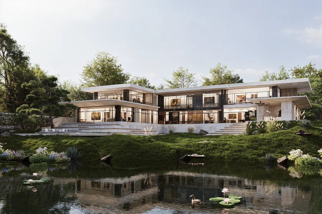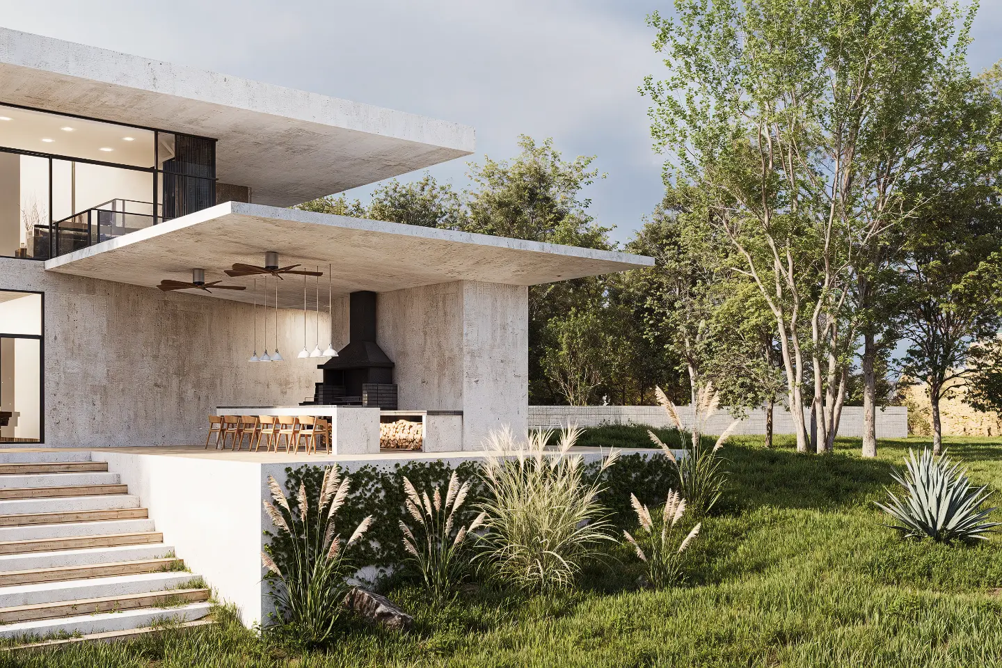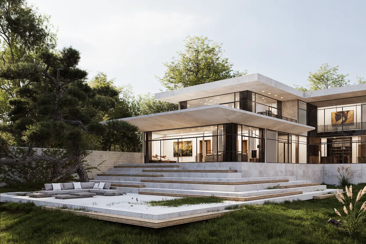 การออกแบบบ้านพักอาศัยสไตล์ Modern Tropical Brutalist มุ่งสร้างสมดุลระหว่างความดิบ เท่ และความอบอุ่น โดยถ่ายทอดเอกลักษณ์ของสถาปัตยกรรม Brutalist ผ่านโครงสร้างเส้นตรงที่ชัดเจน คานทึบแบบ cantilever และหลังคาระนาบราบ ผสานกับกลิ่นอายแบบ Tropical ที่ให้ความรู้สึกผ่อนคลายและกลมกลืนกับธรรมชาติ วัสดุหลักอย่างคอนกรีตเปลือยถูกเลือกใช้ร่วมกับไม้และกระจก เพื่อคลายความแข็งกระด้างของรูปทรงให้ดูนุ่มนวลขึ้น ภายนอกอาคารเน้นการสร้างมิติด้วยพื้นผิวคอนกรีตที่แตกต่างกัน โดยชั้นล่างใช้ผิวเรียบโทนสีอ่อนให้ความรู้สึกโปร่งและเบา ขณะที่ชั้นบนเพิ่มผนังลายหินสีดำเพื่อสร้างจุดเน้นและยกระดับภาพลักษณ์ให้ดูหรูขึ้นโดยไม่หลุดจากธีมหลัก ภายในบ้านออกแบบให้โปร่งสว่างด้วยช่องเปิดกระจกแนวกว้าง เชื่อมโยงพื้นที่ภายในกับภายนอก พร้อมเสริมบรรยากาศอบอุ่นด้วยวัสดุไม้ สะท้อนแนวคิดการอยู่อาศัยที่เรียบง่าย ทันสมัย และสอดคล้องกับสภาพแวดล้อมเขตร้อนอย่างแท้จริง.